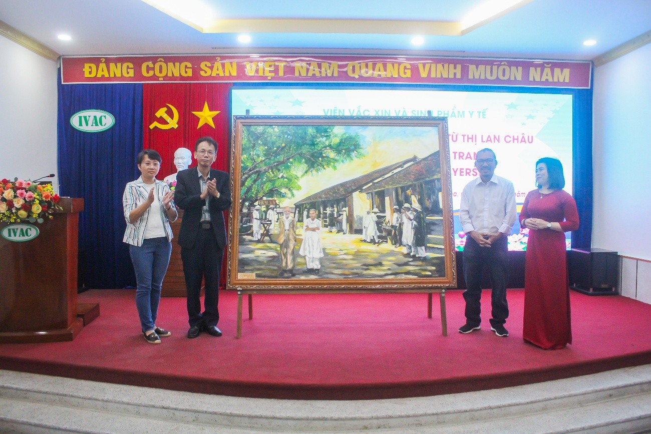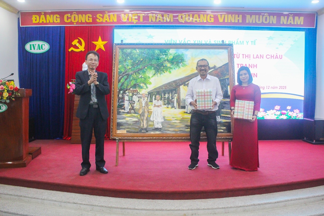 Trong khuôn khổ chương trình, Ban lãnh đạo Viện đã trang trọng tiếp nhận món quà kỷ niệm là bức tranh “Bác sĩ A. Yersin làm việc tại Trại Chăn nuôi Suối Dầu”, do nghệ nhân Hùng và họa sĩ Từ Thị Lan Châu sáng tác và trao tặng. Các đại biểu đã được nghe họa sĩ chia sẻ về giá trị lịch sử, nghệ thuật và ý nghĩa nhân văn sâu sắc của tác phẩm. Nhằm trân trọng và ghi nhận tấm lòng của tác giả, Ban lãnh đạo Viện đã trao tặng quà lưu niệm như lời cảm ơn chân thành.